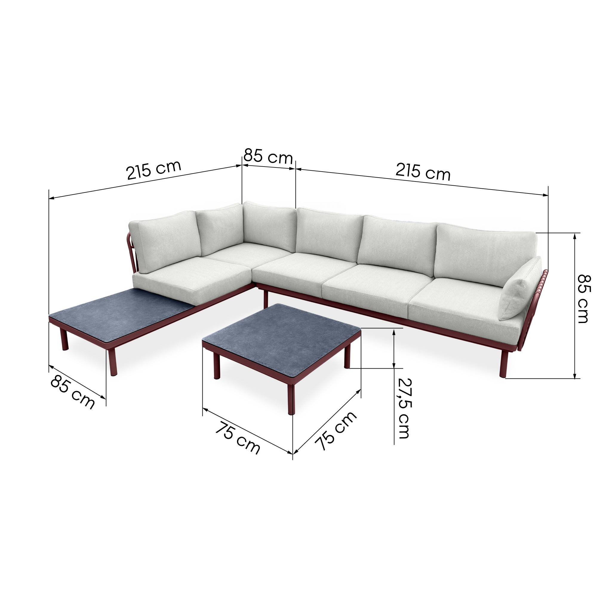 Wysokość: stolik 27,5 cm, moduły narożnika 85 cm