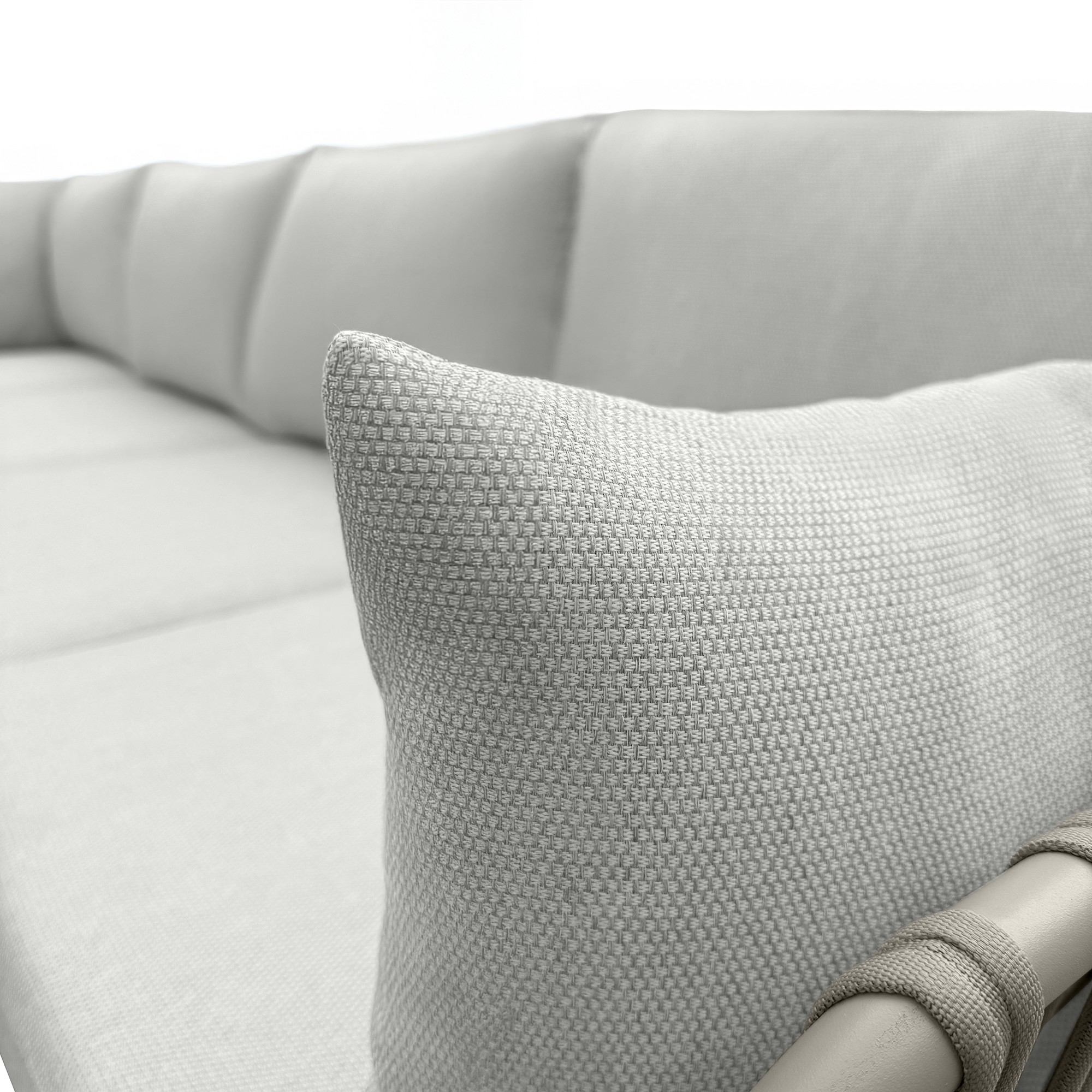 ✔ Plecionka z trwałego sznurka na oparciach i podłokietnikach – elegancki detal podkreślający nowoczesny charakter mebli