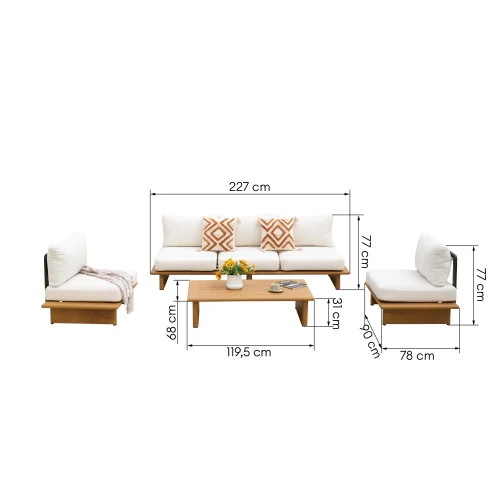 W skład zestawu wchodzi 3-osobowa sofa, dwa fotele oraz prostokątny stolik kawowy, tworząc wygodną przestrzeń do relaksu, rozmów czy popołudniowej kawy. Solidne oparcia z wytrzymałej liny w kolorze beżowym nadają meblom nowoczesnego charakteru, a miękkie poduszki w odcieniu jasnego beżu zapewniają wysoki komfort użytkowania. Pokrowce z tkaniny Poly Spun (250 g/m²) są odporne na warunki atmosferyczne i łatwe w pielęgnacji. Dla zachowania ich trwałości, rekomendujemy przechowywanie w zadaszonym miejscu podczas opadów.